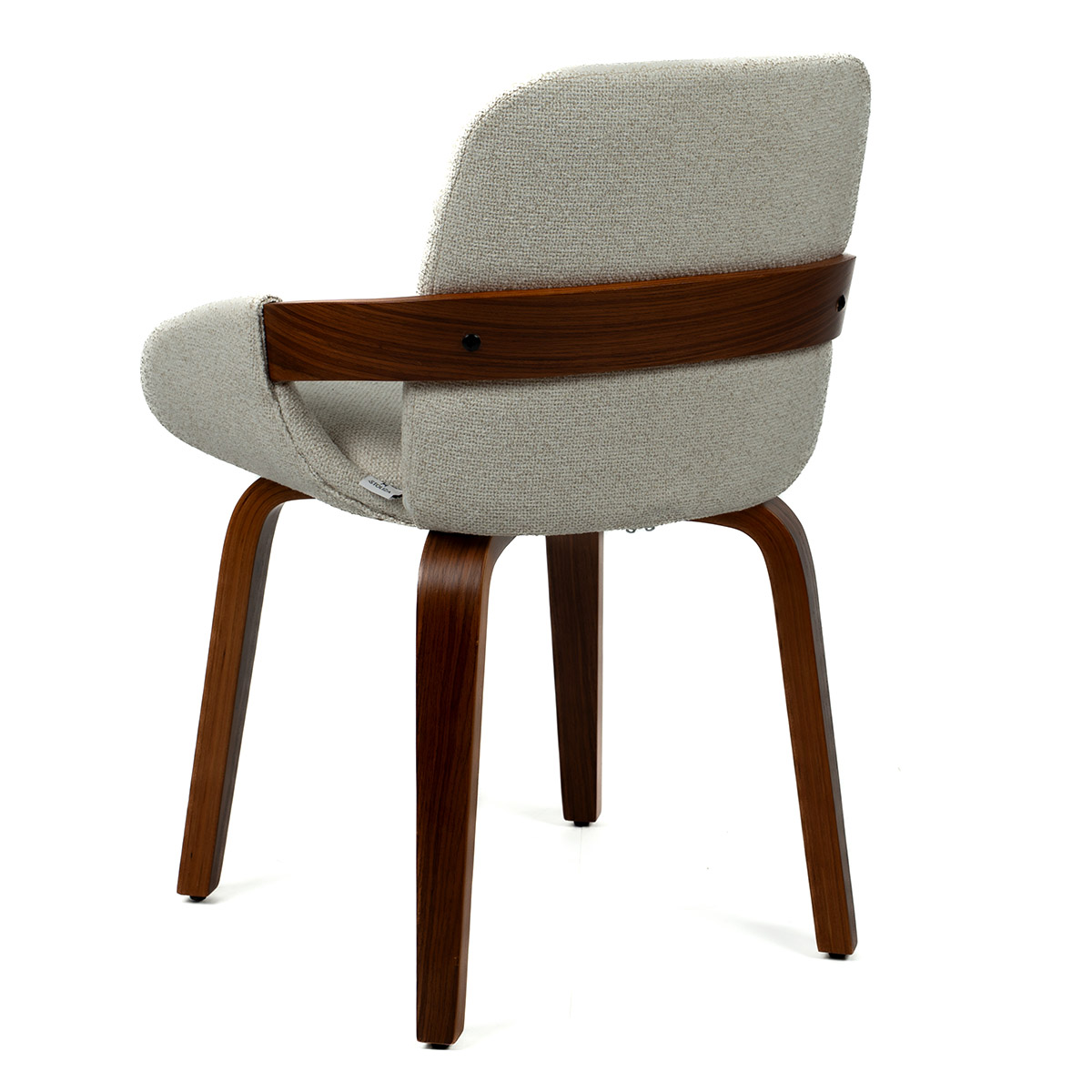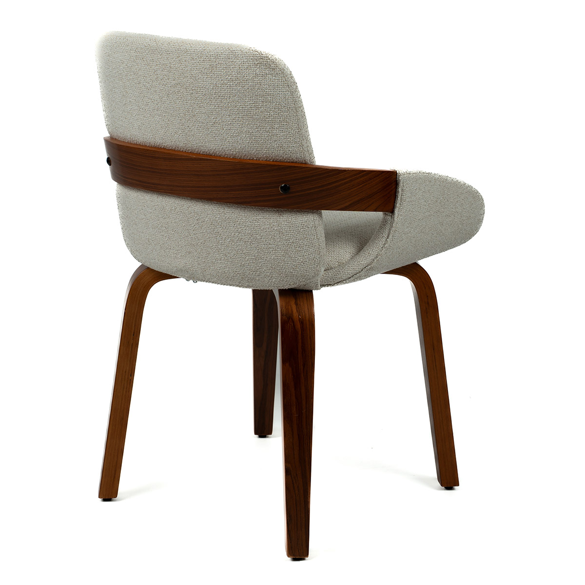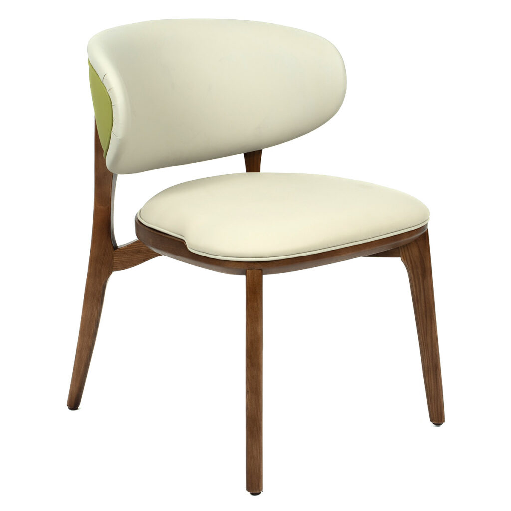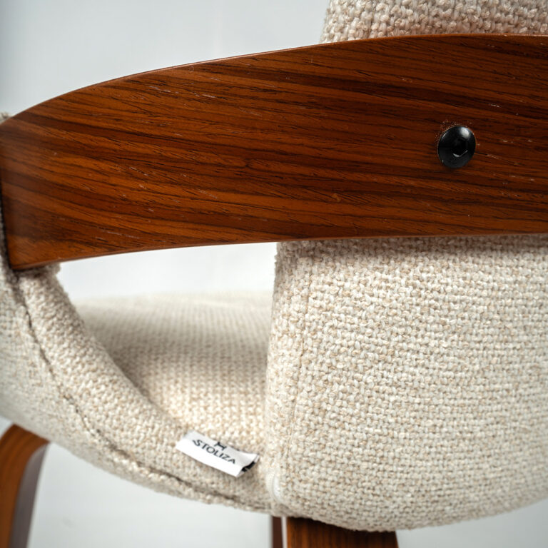 Kibi stolica u tamnijoj varijanti donosi ozbiljniji, elegantniji ton prostoru. Tekstura bež tkanine lepo se slaže sa tamnim drvetom, stvarajući kontrast koji odiše toplinom i stabilnošću. Oblik naslona i sedišta obezbeđuje udobnost, dok prirodni materijali garantuju dug vek trajanja.