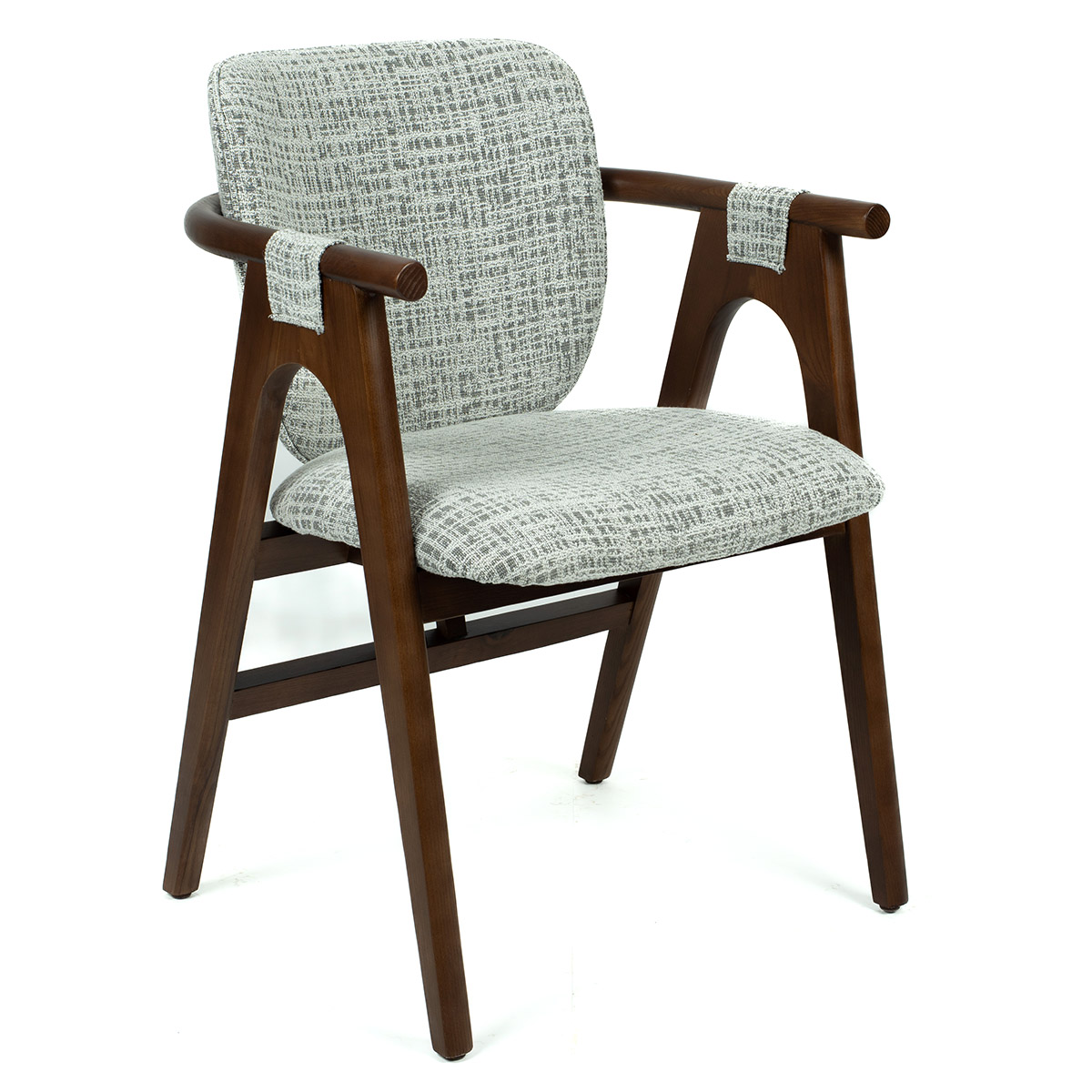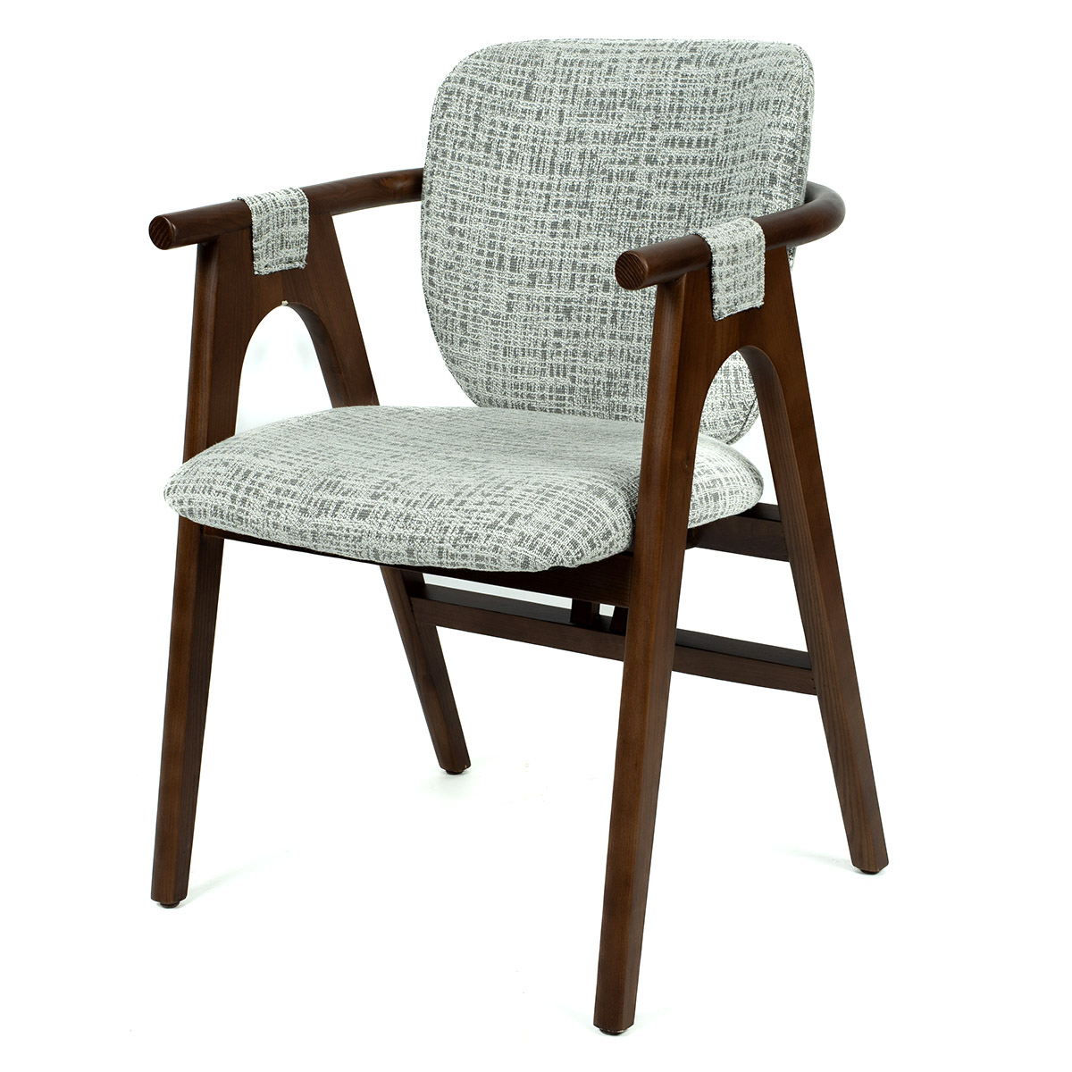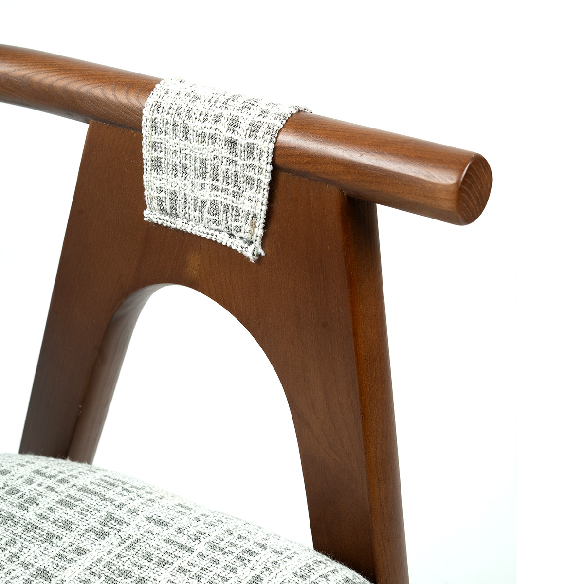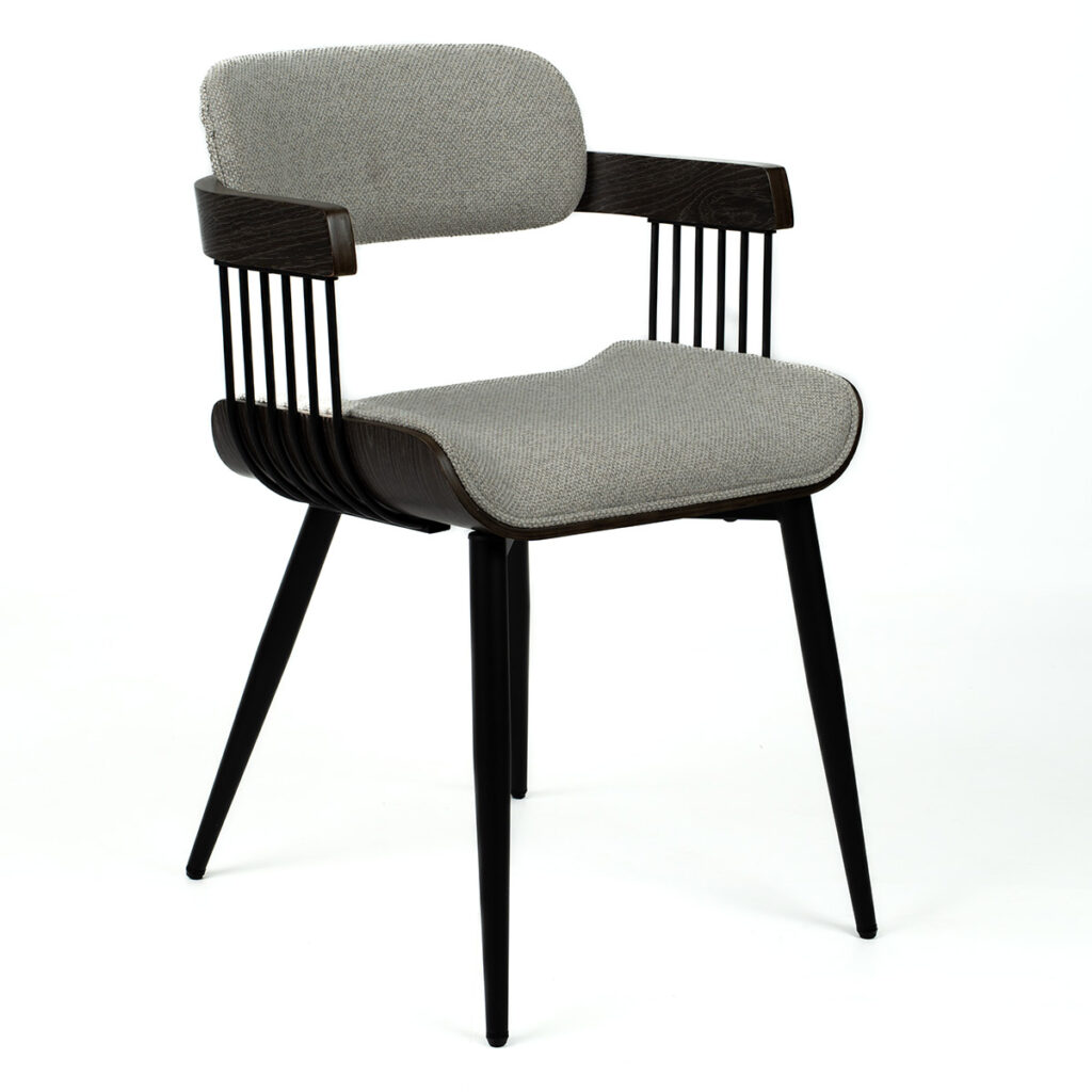 Nilo stolica kombinuje retro šarm i diskretnu eleganciju. Njeni drveni rukonasloni sa tkaninom u detaljima daju dozu glamura bez preterivanja, dok blago zaobljene linije i tapacirano sedište pružaju udobnost i toplinu. Konstrukcija od prirodnog drveta obezbeđuje stabilnost i trajnost, a neutralna šara tkanine lako se uklapa u različite stilove enterijera.
